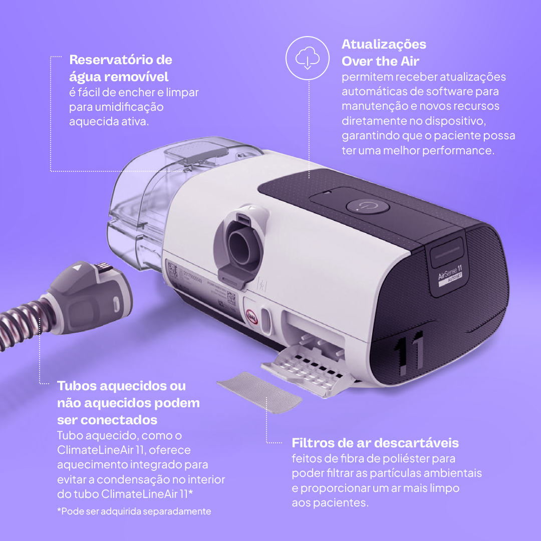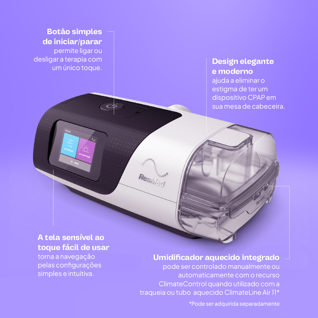 Dispositivo com ajuste automático de pressão, baseado em algoritmos que respondem às variações respiratórias durante o sono. Inclui também o algoritmo AutoSet™ For Her™, desenvolvido para atender às características respiratórias específicas observadas em mulheres, oferecendo ajustes mais sensíveis e conforto adicional.